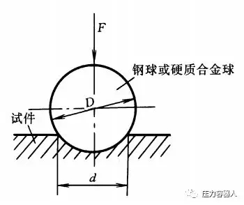 用直徑D的淬火鋼球或硬質合金球作壓頭,以相應的試驗力F壓入試件表面,經規定的保持時間后,卸除試驗力,得到一直徑為d的壓痕。用試驗力除以壓痕表面積,所得值即為布氏硬度值,符號用HBS或HBW表示。