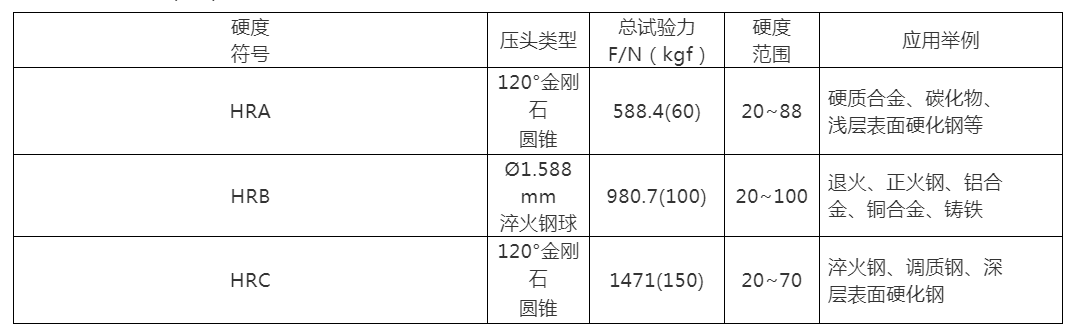 用錐頂角為120°的金剛石圓錐或Ø1.588mm和Ø3.176mm淬火鋼球作壓頭和載荷配合使用,在10kgf初載荷和60、100或150kgf力總載荷(即初載荷加主載荷)先后作用下壓入試樣,在總載荷作用后,以卸除主載荷而保留主載荷時的壓入深度與初載荷作用下壓入深度之差來表示硬度。
